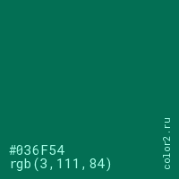 Цвет #036F54 в цветовой модели RGB обозначается тремя октетами (3, 111, 84) в десятичном формате и #036F54 в шестнадцатиричном (hex) формате, которые являются интенсивностью красного 3 (hex 03), интенсивность зелёного 111 (hex 6F) и интенсивность синего 84 (hex 54).