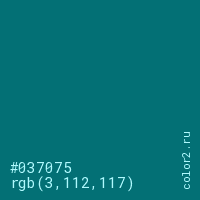 Цвет #037075 в цветовой модели RGB обозначается тремя октетами (3, 112, 117) в десятичном формате и #037075 в шестнадцатиричном (hex) формате, которые являются интенсивностью красного 3 (hex 03), интенсивность зелёного 112 (hex 70) и интенсивность синего 117 (hex 75).