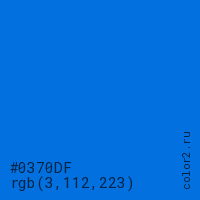 Цвет #0370DF в цветовой модели RGB обозначается тремя октетами (3, 112, 223) в десятичном формате и #0370DF в шестнадцатиричном (hex) формате, которые являются интенсивностью красного 3 (hex 03), интенсивность зелёного 112 (hex 70) и интенсивность синего 223 (hex DF).