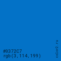 Цвет #0372C7 в цветовой модели RGB обозначается тремя октетами (3, 114, 199) в десятичном формате и #0372C7 в шестнадцатиричном (hex) формате, которые являются интенсивностью красного 3 (hex 03), интенсивность зелёного 114 (hex 72) и интенсивность синего 199 (hex C7).