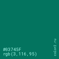Цвет #03745F в цветовой модели RGB обозначается тремя октетами (3, 116, 95) в десятичном формате и #03745F в шестнадцатиричном (hex) формате, которые являются интенсивностью красного 3 (hex 03), интенсивность зелёного 116 (hex 74) и интенсивность синего 95 (hex 5F).