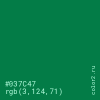 Цвет #037C47 в цветовой модели RGB обозначается тремя октетами (3, 124, 71) в десятичном формате и #037C47 в шестнадцатиричном (hex) формате, которые являются интенсивностью красного 3 (hex 03), интенсивность зелёного 124 (hex 7C) и интенсивность синего 71 (hex 47).