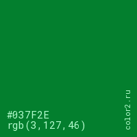 Цвет #037F2E в цветовой модели RGB обозначается тремя октетами (3, 127, 46) в десятичном формате и #037F2E в шестнадцатиричном (hex) формате, которые являются интенсивностью красного 3 (hex 03), интенсивность зелёного 127 (hex 7F) и интенсивность синего 46 (hex 2E).