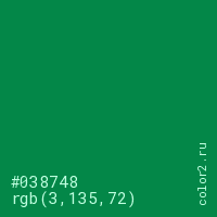 Цвет #038748 в цветовой модели RGB обозначается тремя октетами (3, 135, 72) в десятичном формате и #038748 в шестнадцатиричном (hex) формате, которые являются интенсивностью красного 3 (hex 03), интенсивность зелёного 135 (hex 87) и интенсивность синего 72 (hex 48).