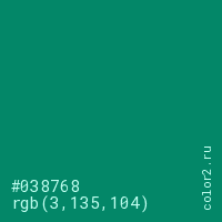 Цвет #038768 в цветовой модели RGB обозначается тремя октетами (3, 135, 104) в десятичном формате и #038768 в шестнадцатиричном (hex) формате, которые являются интенсивностью красного 3 (hex 03), интенсивность зелёного 135 (hex 87) и интенсивность синего 104 (hex 68).
