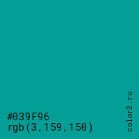 Цвет #039F96 в цветовой модели RGB обозначается тремя октетами (3, 159, 150) в десятичном формате и #039F96 в шестнадцатиричном (hex) формате, которые являются интенсивностью красного 3 (hex 03), интенсивность зелёного 159 (hex 9F) и интенсивность синего 150 (hex 96).