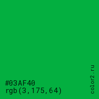 Цвет #03AF40 в цветовой модели RGB обозначается тремя октетами (3, 175, 64) в десятичном формате и #03AF40 в шестнадцатиричном (hex) формате, которые являются интенсивностью красного 3 (hex 03), интенсивность зелёного 175 (hex AF) и интенсивность синего 64 (hex 40).