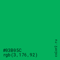 Цвет #03B05C в цветовой модели RGB обозначается тремя октетами (3, 176, 92) в десятичном формате и #03B05C в шестнадцатиричном (hex) формате, которые являются интенсивностью красного 3 (hex 03), интенсивность зелёного 176 (hex B0) и интенсивность синего 92 (hex 5C).