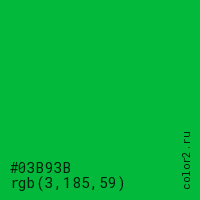 Цвет #03B93B в цветовой модели RGB обозначается тремя октетами (3, 185, 59) в десятичном формате и #03B93B в шестнадцатиричном (hex) формате, которые являются интенсивностью красного 3 (hex 03), интенсивность зелёного 185 (hex B9) и интенсивность синего 59 (hex 3B).