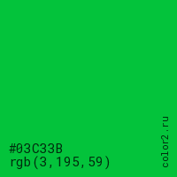 Цвет #03C33B в цветовой модели RGB обозначается тремя октетами (3, 195, 59) в десятичном формате и #03C33B в шестнадцатиричном (hex) формате, которые являются интенсивностью красного 3 (hex 03), интенсивность зелёного 195 (hex C3) и интенсивность синего 59 (hex 3B).