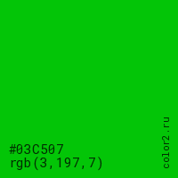 Цвет #03C507 в цветовой модели RGB обозначается тремя октетами (3, 197, 7) в десятичном формате и #03C507 в шестнадцатиричном (hex) формате, которые являются интенсивностью красного 3 (hex 03), интенсивность зелёного 197 (hex C5) и интенсивность синего 7 (hex 07).