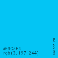 Цвет #03C5F4 в цветовой модели RGB обозначается тремя октетами (3, 197, 244) в десятичном формате и #03C5F4 в шестнадцатиричном (hex) формате, которые являются интенсивностью красного 3 (hex 03), интенсивность зелёного 197 (hex C5) и интенсивность синего 244 (hex F4).