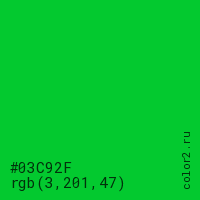 Цвет #03C92F в цветовой модели RGB обозначается тремя октетами (3, 201, 47) в десятичном формате и #03C92F в шестнадцатиричном (hex) формате, которые являются интенсивностью красного 3 (hex 03), интенсивность зелёного 201 (hex C9) и интенсивность синего 47 (hex 2F).
