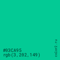 Цвет #03CA95 в цветовой модели RGB обозначается тремя октетами (3, 202, 149) в десятичном формате и #03CA95 в шестнадцатиричном (hex) формате, которые являются интенсивностью красного 3 (hex 03), интенсивность зелёного 202 (hex CA) и интенсивность синего 149 (hex 95).