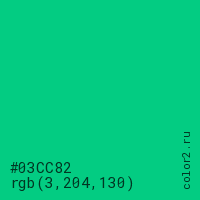 Цвет #03CC82 в цветовой модели RGB обозначается тремя октетами (3, 204, 130) в десятичном формате и #03CC82 в шестнадцатиричном (hex) формате, которые являются интенсивностью красного 3 (hex 03), интенсивность зелёного 204 (hex CC) и интенсивность синего 130 (hex 82).