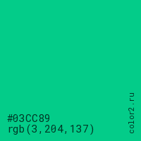 Цвет #03CC89 в цветовой модели RGB обозначается тремя октетами (3, 204, 137) в десятичном формате и #03CC89 в шестнадцатиричном (hex) формате, которые являются интенсивностью красного 3 (hex 03), интенсивность зелёного 204 (hex CC) и интенсивность синего 137 (hex 89).