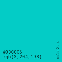 Цвет #03CCC6 в цветовой модели RGB обозначается тремя октетами (3, 204, 198) в десятичном формате и #03CCC6 в шестнадцатиричном (hex) формате, которые являются интенсивностью красного 3 (hex 03), интенсивность зелёного 204 (hex CC) и интенсивность синего 198 (hex C6).