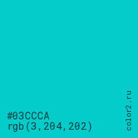 Цвет #03CCCA в цветовой модели RGB обозначается тремя октетами (3, 204, 202) в десятичном формате и #03CCCA в шестнадцатиричном (hex) формате, которые являются интенсивностью красного 3 (hex 03), интенсивность зелёного 204 (hex CC) и интенсивность синего 202 (hex CA).
