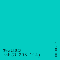Цвет #03CDC2 в цветовой модели RGB обозначается тремя октетами (3, 205, 194) в десятичном формате и #03CDC2 в шестнадцатиричном (hex) формате, которые являются интенсивностью красного 3 (hex 03), интенсивность зелёного 205 (hex CD) и интенсивность синего 194 (hex C2).