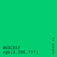 Цвет #03CE6F в цветовой модели RGB обозначается тремя октетами (3, 206, 111) в десятичном формате и #03CE6F в шестнадцатиричном (hex) формате, которые являются интенсивностью красного 3 (hex 03), интенсивность зелёного 206 (hex CE) и интенсивность синего 111 (hex 6F).