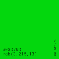 Цвет #03D70D в цветовой модели RGB обозначается тремя октетами (3, 215, 13) в десятичном формате и #03D70D в шестнадцатиричном (hex) формате, которые являются интенсивностью красного 3 (hex 03), интенсивность зелёного 215 (hex D7) и интенсивность синего 13 (hex 0D).