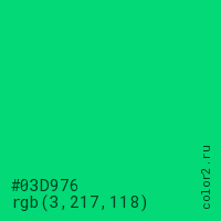 Цвет #03D976 в цветовой модели RGB обозначается тремя октетами (3, 217, 118) в десятичном формате и #03D976 в шестнадцатиричном (hex) формате, которые являются интенсивностью красного 3 (hex 03), интенсивность зелёного 217 (hex D9) и интенсивность синего 118 (hex 76).