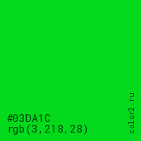 Цвет #03DA1C в цветовой модели RGB обозначается тремя октетами (3, 218, 28) в десятичном формате и #03DA1C в шестнадцатиричном (hex) формате, которые являются интенсивностью красного 3 (hex 03), интенсивность зелёного 218 (hex DA) и интенсивность синего 28 (hex 1C).