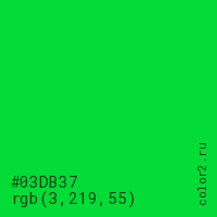 Цвет #03DB37 в цветовой модели RGB обозначается тремя октетами (3, 219, 55) в десятичном формате и #03DB37 в шестнадцатиричном (hex) формате, которые являются интенсивностью красного 3 (hex 03), интенсивность зелёного 219 (hex DB) и интенсивность синего 55 (hex 37).