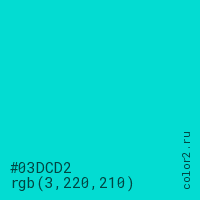 Цвет #03DCD2 в цветовой модели RGB обозначается тремя октетами (3, 220, 210) в десятичном формате и #03DCD2 в шестнадцатиричном (hex) формате, которые являются интенсивностью красного 3 (hex 03), интенсивность зелёного 220 (hex DC) и интенсивность синего 210 (hex D2).