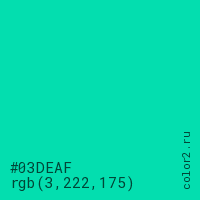 Цвет #03DEAF в цветовой модели RGB обозначается тремя октетами (3, 222, 175) в десятичном формате и #03DEAF в шестнадцатиричном (hex) формате, которые являются интенсивностью красного 3 (hex 03), интенсивность зелёного 222 (hex DE) и интенсивность синего 175 (hex AF).