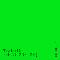Цвет #03E618 в цветовой модели RGB обозначается тремя октетами (3, 230, 24) в десятичном формате и #03E618 в шестнадцатиричном (hex) формате, которые являются интенсивностью красного 3 (hex 03), интенсивность зелёного 230 (hex E6) и интенсивность синего 24 (hex 18).