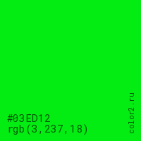 Цвет #03ED12 в цветовой модели RGB обозначается тремя октетами (3, 237, 18) в десятичном формате и #03ED12 в шестнадцатиричном (hex) формате, которые являются интенсивностью красного 3 (hex 03), интенсивность зелёного 237 (hex ED) и интенсивность синего 18 (hex 12).