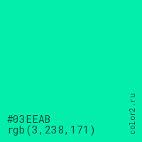 Цвет #03EEAB в цветовой модели RGB обозначается тремя октетами (3, 238, 171) в десятичном формате и #03EEAB в шестнадцатиричном (hex) формате, которые являются интенсивностью красного 3 (hex 03), интенсивность зелёного 238 (hex EE) и интенсивность синего 171 (hex AB).