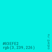 Цвет #03EFE2 в цветовой модели RGB обозначается тремя октетами (3, 239, 226) в десятичном формате и #03EFE2 в шестнадцатиричном (hex) формате, которые являются интенсивностью красного 3 (hex 03), интенсивность зелёного 239 (hex EF) и интенсивность синего 226 (hex E2).