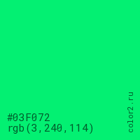 Цвет #03F072 в цветовой модели RGB обозначается тремя октетами (3, 240, 114) в десятичном формате и #03F072 в шестнадцатиричном (hex) формате, которые являются интенсивностью красного 3 (hex 03), интенсивность зелёного 240 (hex F0) и интенсивность синего 114 (hex 72).