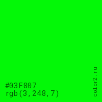 Цвет #03F807 в цветовой модели RGB обозначается тремя октетами (3, 248, 7) в десятичном формате и #03F807 в шестнадцатиричном (hex) формате, которые являются интенсивностью красного 3 (hex 03), интенсивность зелёного 248 (hex F8) и интенсивность синего 7 (hex 07).