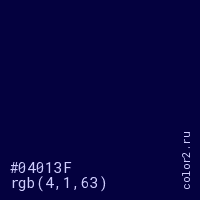 Цвет #04013F в цветовой модели RGB обозначается тремя октетами (4, 1, 63) в десятичном формате и #04013F в шестнадцатиричном (hex) формате, которые являются интенсивностью красного 4 (hex 04), интенсивность зелёного 1 (hex 01) и интенсивность синего 63 (hex 3F).