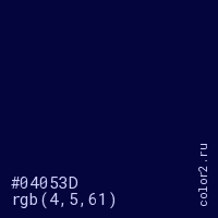 Цвет #04053D в цветовой модели RGB обозначается тремя октетами (4, 5, 61) в десятичном формате и #04053D в шестнадцатиричном (hex) формате, которые являются интенсивностью красного 4 (hex 04), интенсивность зелёного 5 (hex 05) и интенсивность синего 61 (hex 3D).