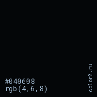 Цвет #040608 в цветовой модели RGB обозначается тремя октетами (4, 6, 8) в десятичном формате и #040608 в шестнадцатиричном (hex) формате, которые являются интенсивностью красного 4 (hex 04), интенсивность зелёного 6 (hex 06) и интенсивность синего 8 (hex 08).