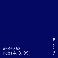 Цвет #040863 в цветовой модели RGB обозначается тремя октетами (4, 8, 99) в десятичном формате и #040863 в шестнадцатиричном (hex) формате, которые являются интенсивностью красного 4 (hex 04), интенсивность зелёного 8 (hex 08) и интенсивность синего 99 (hex 63).