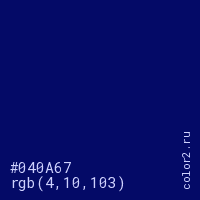 Цвет #040A67 в цветовой модели RGB обозначается тремя октетами (4, 10, 103) в десятичном формате и #040A67 в шестнадцатиричном (hex) формате, которые являются интенсивностью красного 4 (hex 04), интенсивность зелёного 10 (hex 0A) и интенсивность синего 103 (hex 67).