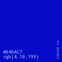 Цвет #040AC7 в цветовой модели RGB обозначается тремя октетами (4, 10, 199) в десятичном формате и #040AC7 в шестнадцатиричном (hex) формате, которые являются интенсивностью красного 4 (hex 04), интенсивность зелёного 10 (hex 0A) и интенсивность синего 199 (hex C7).