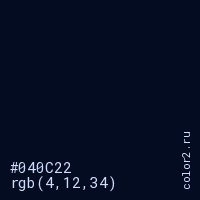 Цвет #040C22 в цветовой модели RGB обозначается тремя октетами (4, 12, 34) в десятичном формате и #040C22 в шестнадцатиричном (hex) формате, которые являются интенсивностью красного 4 (hex 04), интенсивность зелёного 12 (hex 0C) и интенсивность синего 34 (hex 22).