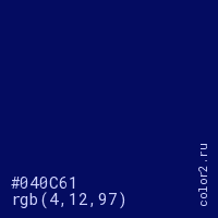 Цвет #040C61 в цветовой модели RGB обозначается тремя октетами (4, 12, 97) в десятичном формате и #040C61 в шестнадцатиричном (hex) формате, которые являются интенсивностью красного 4 (hex 04), интенсивность зелёного 12 (hex 0C) и интенсивность синего 97 (hex 61).