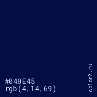 Цвет #040E45 в цветовой модели RGB обозначается тремя октетами (4, 14, 69) в десятичном формате и #040E45 в шестнадцатиричном (hex) формате, которые являются интенсивностью красного 4 (hex 04), интенсивность зелёного 14 (hex 0E) и интенсивность синего 69 (hex 45).