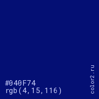 Цвет #040F74 в цветовой модели RGB обозначается тремя октетами (4, 15, 116) в десятичном формате и #040F74 в шестнадцатиричном (hex) формате, которые являются интенсивностью красного 4 (hex 04), интенсивность зелёного 15 (hex 0F) и интенсивность синего 116 (hex 74).