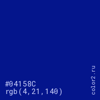 Цвет #04158C в цветовой модели RGB обозначается тремя октетами (4, 21, 140) в десятичном формате и #04158C в шестнадцатиричном (hex) формате, которые являются интенсивностью красного 4 (hex 04), интенсивность зелёного 21 (hex 15) и интенсивность синего 140 (hex 8C).