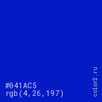 Цвет #041AC5 в цветовой модели RGB обозначается тремя октетами (4, 26, 197) в десятичном формате и #041AC5 в шестнадцатиричном (hex) формате, которые являются интенсивностью красного 4 (hex 04), интенсивность зелёного 26 (hex 1A) и интенсивность синего 197 (hex C5).