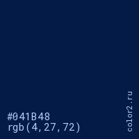 Цвет #041B48 в цветовой модели RGB обозначается тремя октетами (4, 27, 72) в десятичном формате и #041B48 в шестнадцатиричном (hex) формате, которые являются интенсивностью красного 4 (hex 04), интенсивность зелёного 27 (hex 1B) и интенсивность синего 72 (hex 48).