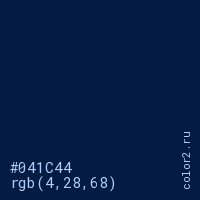 Цвет #041C44 в цветовой модели RGB обозначается тремя октетами (4, 28, 68) в десятичном формате и #041C44 в шестнадцатиричном (hex) формате, которые являются интенсивностью красного 4 (hex 04), интенсивность зелёного 28 (hex 1C) и интенсивность синего 68 (hex 44).